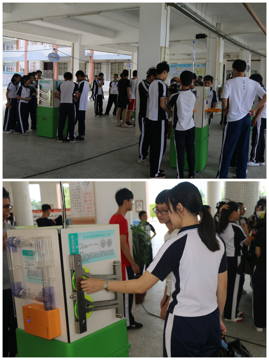 “科普大篷车”为海丰县实验中学师生带来了丰富的车载科普展品和青少年科技创新大赛优秀作品图片,其中有VR体验、健康生活、视觉体验、电磁与材料、机械传动、运动与力六大方面的科普内容,如“槽轮机构”、“意念弯勺”、“太阳能发电”、“空中成像”等科普展品将科学原理、科学现象直观地展现在我们面前。这些展品涵盖了光学、电磁学、声学、力学等知识,让学生们在“试一试”、“看一看”、“想一想”中尽享一场“科技盛宴”。