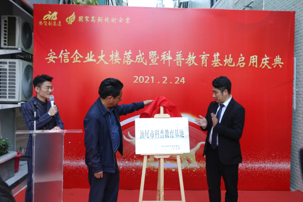 2月24日,“汕尾市科普教育基地工作交流会暨科普教育基地揭牌仪式”在安信新基建(广东)有限公司举行。市人大常委会副主任、市科协主席黄宏伟出席并讲话,市科协党组书记、常务副主席杨敏文,专职副主席柯梁恭等领导共同为安信新基建(广东)有限公司科普教育基地揭牌。城区科协领导及汕尾市各科普教育基地相关负责人出席了活动。