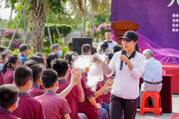 启动仪式在东莞科技馆科技辅导老师《比冰还冷》的科普秀中拉开帷幕,结合一个个精彩的互动小实验,让现场的科学氛围愈加浓厚!随后,省、市、县领导共同上台点亮“中国流动科技馆”广东省巡展活动·海丰站启动球,巡展活动正式启动。参与启动仪式的领导、嘉宾和师生代表观看了东莞科技博物馆航模队带来的航模飞行表演并参观了流动科技馆。