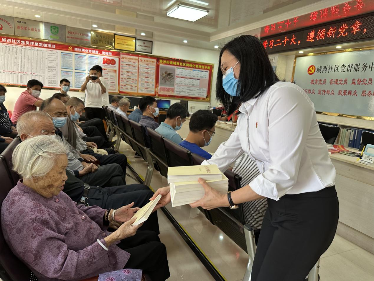 在听取意见凝共识,共建单位结合“送学”内容,提出“金点子”环节中,城区科协常务副主席廖海娜为社区党员送上了《党的二十大报告学习辅导百问》《党的二十大文件汇编》《论中国共产党历史》《习近平新时代中国特色社会主义思想学习问答》等书籍,与他们一起学习党史,重温党的辉煌历程,从党史资料中汲取红色营养,继续发挥好一名党员的先锋模范作用。并就党的二十大报告中强调要“实施更加积极、更加开放有效的人才政策,引导广大人才爱党报国、敬业奉献、服务人民”这一内容,结合近年来汕尾城区人才工作措施以及本部门职能等方面,对城区科技领域人才培养提出了个人的看法。表示下来将深入学习贯彻党的二十大精神和中央人才工作会议精神,主动对标对表,统一思想、统一意志、统一行动,牢牢把握科协组织的平台属性、群团属性,把各方面优秀人才聚集到党和人民事业中来,为深入实施科教兴国战略、人才兴国战略和创新驱动发展战略厚植创新人才培养土壤。