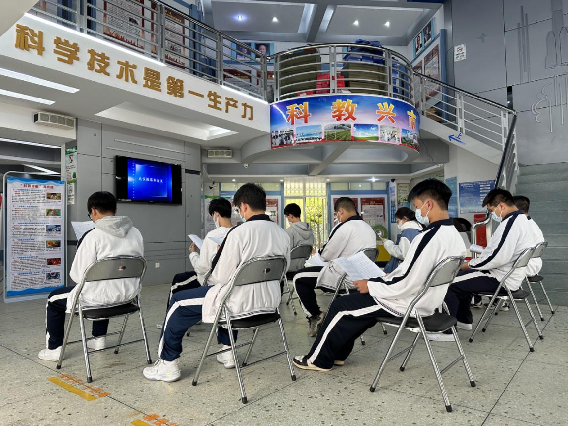学生代表们结合学习资料观看视频