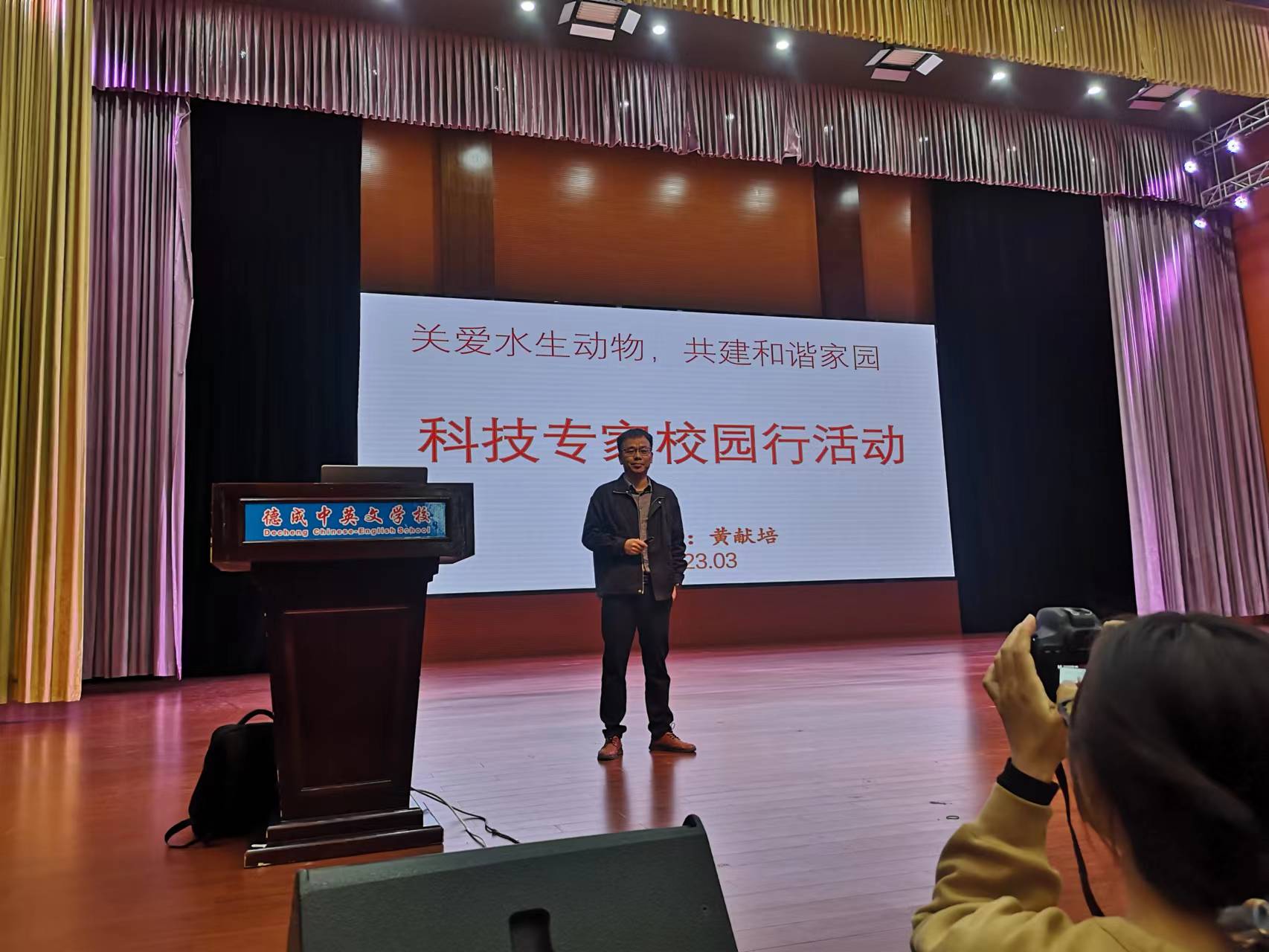 为全面贯彻落实市委市政府百县千镇万村高质量发展工程,引领科技工作者围绕市委市政府中心工作,服务科技创新、服务百县千镇万村高质量发展,充分发挥科技工作者的技术技能,帮助企业解决技术难题和技术创新,3月6日,市科学技术协会在海丰县德成中英文学校德成小镇举办“科技专家校园行”科普专题活动。活动邀请了黄献培、刘镇州、刘定发博士等科技专家参与活动,首场报告由汕尾职业技术学院“水产养育与加工工程研究中心”主任、海洋产业研究院水生生物学博士,生态学博士后黄献培作“保护水生动物 共建和谐家园”主题科普讲座,市文化、教育、科技、体育类科技工作者和德成中英文学校部分初中师生共700多人参加了活动。黄献培博士重点向学生们宣讲了保护水生动物和环境的重要意义及紧迫性,以及保护水生动物,如何从我做起。让传播保护水生动物,保护自然生态环境理念进入校园,保护水生动物,共建和谐家园从我做起。