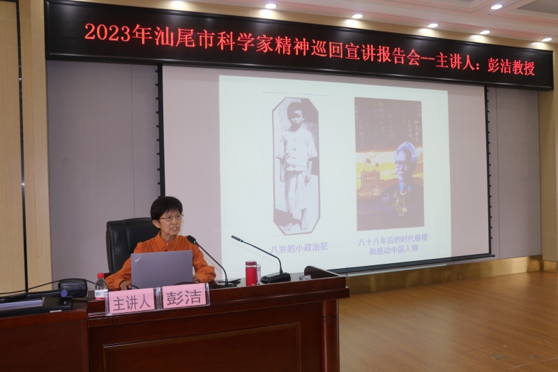 彭洁同志从满门忠烈热血涌、百家养育赤子情、自力更生延河水、负笈求索原子能、核动力路上垦荒牛、情系事业爱祖国等六个方面讲述了她的祖父彭湃经历“富二代——无产者”、“地主少爷——革命先驱”的人生历程,以及她的父亲彭士禄经历从“孤儿——院士”、“小囚犯——科学家”的成长过程的故事。爷爷彭湃为了革命理想毅然与家庭决裂走上革命道路、为革命事业英勇牺牲和父亲彭士禄从孤儿成长为科学家、为中国核动力事业默默奉献、顽强拼搏的感人事迹故事。现场展现了澎湃烈士和彭士禄院士生前一张张珍贵的历史照片,一段段感人肺腑的往事,带领着大家走进前辈们的内心世界,引领着大家传承科学家的爱国情怀,催人奋进,更加激励海陆丰儿女的爱国情怀和努力学习的信心、决心。