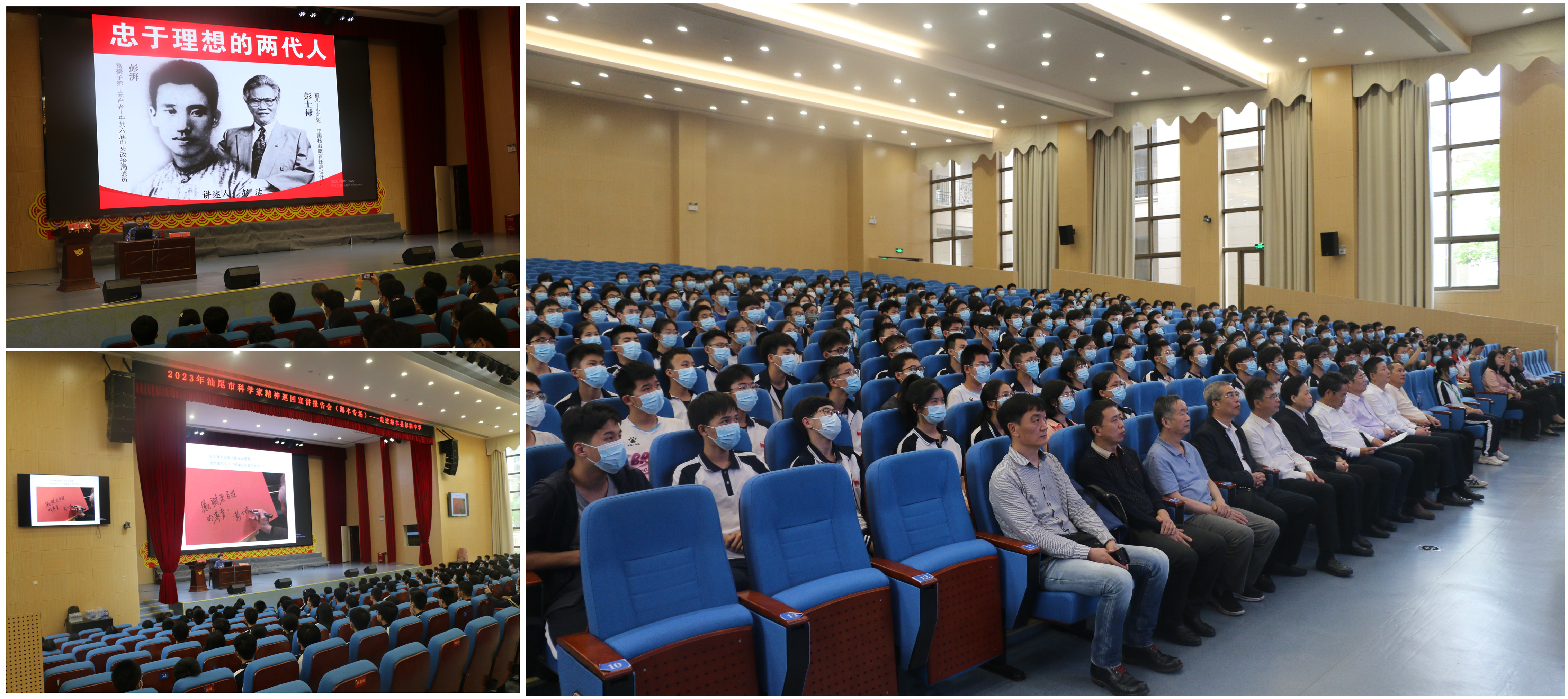 本次活动邀请了彭湃烈士的孙女、彭士禄院士的女儿彭洁研究员作《忠于理想的两代人-讲述彭湃烈士和彭士禄院士的故事》专题报告,彭洁教授以讲故事的形式,从满门忠烈热血涌、百家养育赤子情、自力更生延河水、负笈求索原子能、核动力路上垦荒牛、情系事业爱祖国等六个方面深情讲述了老一辈无产阶级革命家彭湃烈士和中国核潜艇第一任总设计师彭士禄院士忠于理想信仰,爱国敬业,无私奉献的光辉一生。爷爷彭湃从“富二代-无产者”、从“地主少爷-革命先驱”,身怀革命理想,焚田契,交农友,为革命事业甘愿奉献和牺牲。父亲彭士禄从“孤儿-院士”、从“小囚犯-科学家”,经历了被逮捕、被折磨,流离失所,历尽磨难,却始终保持着对祖国和党的热爱,对人民的感恩,对核事业的忠诚。两代人中一个是革命者,一个是科学家,身处不同时代,却都将自己的理想与国家的命运前途紧密联系在一起,将一切献给了国家和人民,各自为中国的站起来和强起来做出了自己应有的贡献。那一张张珍贵鲜活的照片,一段段生动感人的故事,带领着我们走进先辈们的内心世界,引领着大家传承和弘扬以国家民族命运为己任的爱国精神、以爱国主义为根基的科学家精神,更加激励着海陆丰儿女成为能担大任、可堪大用的栋梁之才的信心和决心。