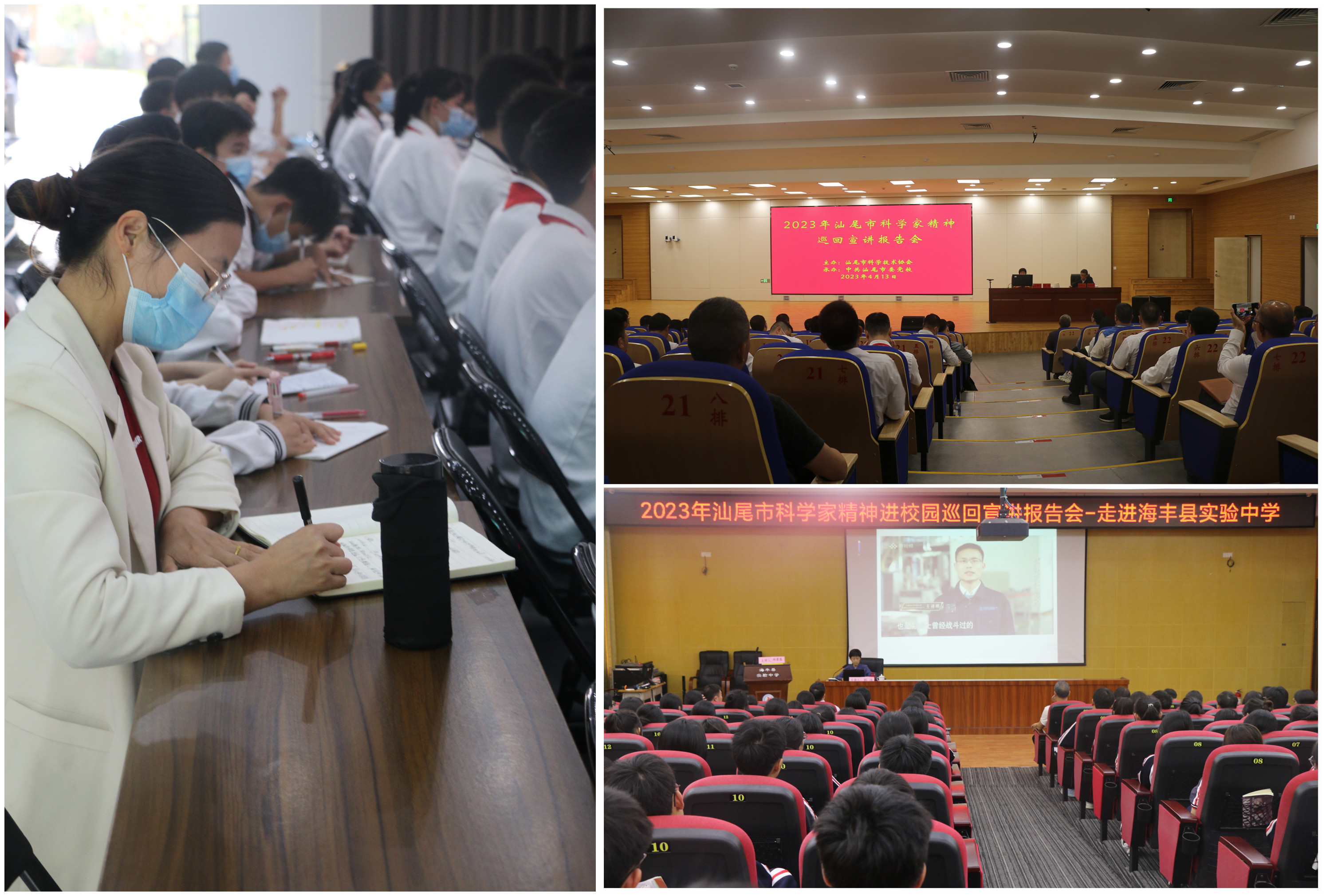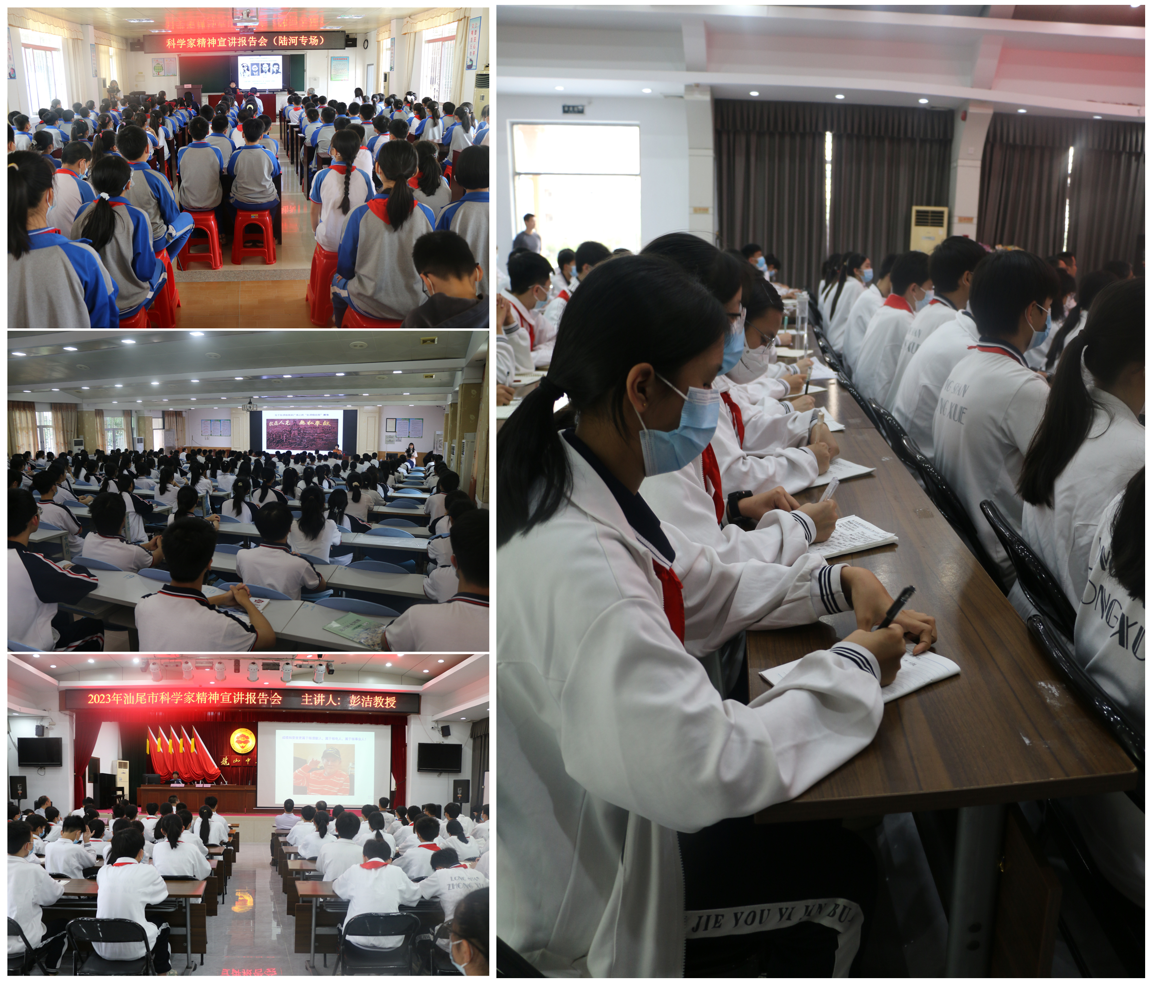 科学家精神巡回宣讲活动首场报告启动仪式于4月11日上午在实验小学举行,市人大常委会副主任、市科协主席黄宏伟出席并致辞。活动由市科协党组书记、常务副主席杨敏文主持,市科协党组成员、专职副主席柯梁恭,市教育局副局长张逸琴、市关工委副主任何汉钳、彭建球,城区科协常务副主席主席廖海娜及市实验小学师生代表共约150人一同聆听报告。4月14日下午,市关工委主任林义君同志亲临海丰县彭湃中学聆听了最后一场专题报告。