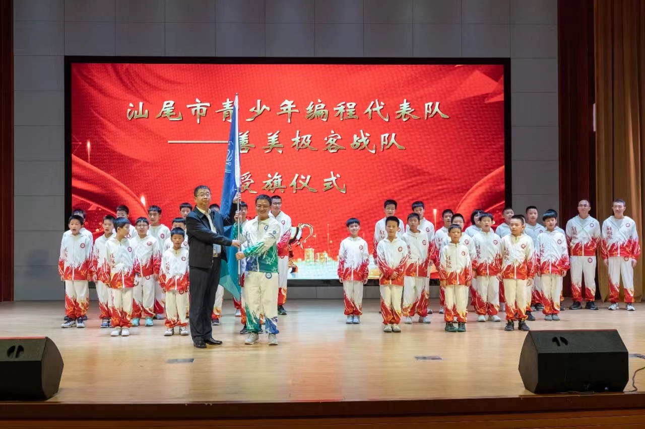 为表彰在我市青少年科技创新大赛和编程竞赛中取得优异成绩的学生和指导教师,鼓励更多的青少年参与科技创新大赛,营造良好的科技创新氛围。12月3日,由汕尾市科协、市教育局、市科技局、市九三学社、汕尾职业技术学院联合举办的“2023年汕尾市青少年科技创新大赛和编程大赛颁奖仪式”在汕尾职业技术学院举行。汕尾市人大常委会副主任、九三学社汕尾市基层委员会主委、市科协主席黄宏伟、汕尾市政府副市长温树斌、汕尾市政协副主席、市教育局党组书记、局长许伟明、汕尾职业技术学院党委书记林来平、广东省计算机学会副理事长兼秘书长黄轩出席活动,省内外青少年科创专家、教授,部分县(市、区)科协、教育局、科技局分管领导、获奖师生及嘉宾近200人参加了活动。市领导黄宏伟、温树斌、许伟明等为获奖学生、优秀科技辅导员、优秀组织工作者、优秀组织单位颁发奖状或奖牌。温树斌副市长并为我市青少年编程代表队—善美极客战队授旗。