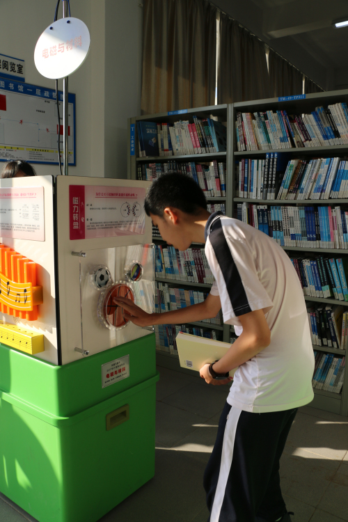图为学生在体验“磁力转盘”