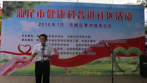 为积极响应市委、市政府关于创建省文明城市的工作要求,为进一步提升社区居民科学素质,7月17日,市科协与市科技局共同联合城区香洲街道党工委、办事处,城区科技文体局、科协和妇联等有关部门在帮扶单位城西社区举办“健康科普进社区”活动。市科协党组书记、常务副主席范志能,市科技局党组书记、局长叶汉汆等单位领导及近百名群众参加了活动。